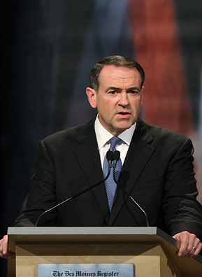 Republican candidate for U.S. President, former Arkansas Gov. Mike Huckabee, speaks during the Des Moines Register Republican Presidential Debate at the Iowa Public Television studios December 12, 2007 in Johnston, Iowa.