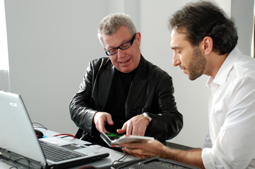 Daniel Libeskind and Weekend America contributor Gideon D'Arcangelo listen to morning music.