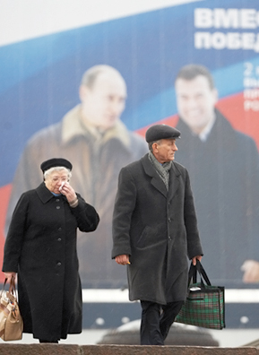 Pedestrians in central Moscow walk past an election poster depicting Russian President Vladimir Putin (left) and his chosen successor Dmitry Medvedev. A slogan on the poster reads: "Together we will win!"