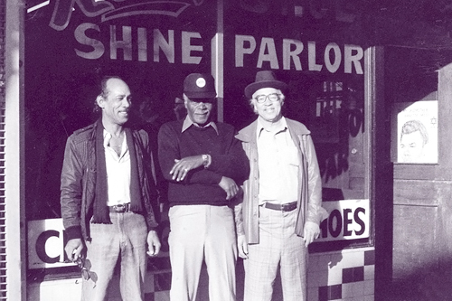 Photo collector Red Powell (right) and friends in front of his shoe-shine parlor in 1970. Powell's business was located in San Francisco's Fillmore District, once an epicenter of San Francisco's African-American community. The walls of Powell's shop were lined with photos depicting the neighborhood's hey-day as an international jazz destination.