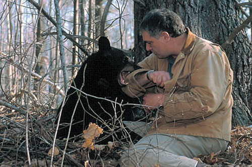Ben Kilham plays with a young black bear cub.