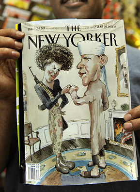 New York City newsstand owner Taleb Alkardai holds a New Yorker magazine with a cover that depicts Democratic presidential candidate Barack Obama dressed as a Muslim and his wife as a militant sporting an Angela-Davis-style afro while the U.S. flag burns in a fireplace that has a portrait of Osama Bin Laden hanging over it. Barack Obama's campaign called the magazine cover "tasteless and offensive."