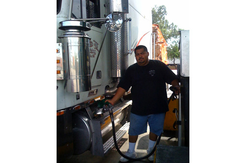 Trucker Jesse Cerna of Glendale, Ariz., pauses at the Liberty Fuel Travel Center to fill his tank.