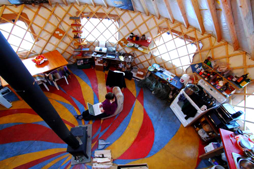 Erin McKittrick writes inside the yurt. The couple say the yurt is somewhat similar to a studio apartment - except with no interior walls and a woodstove in the middle.