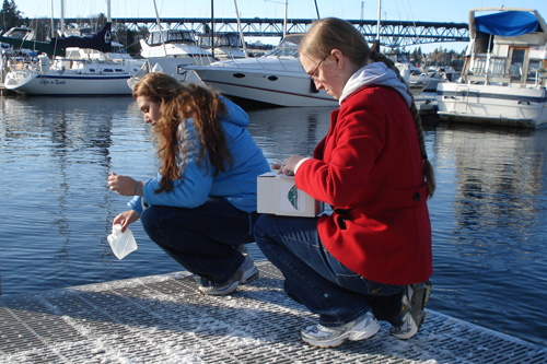Volunteer scientists Liana Singh and Brittany Kimball demonstrate how to gather a water sample.